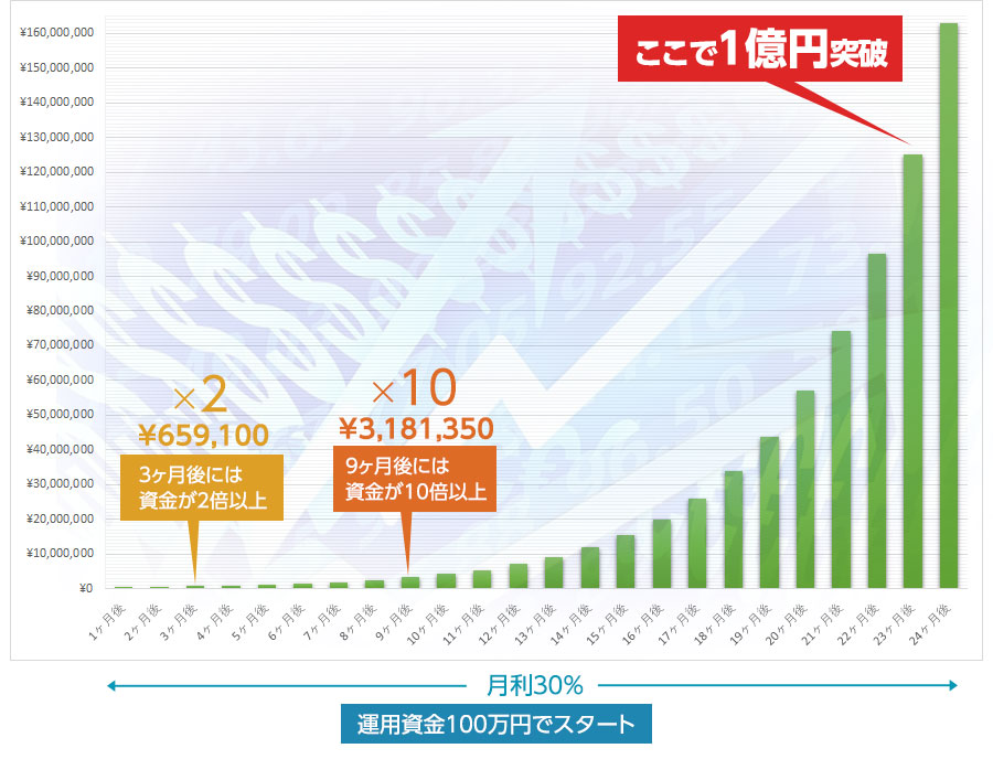 例えば、仮に月利30%のパフォーマンスを出せた場合、30万円の資金を準備してトレードを開始すると、23ヶ月目には1億円を突破します。